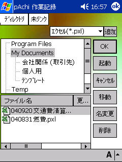 この画面はMy Documents内のファイルのみを対象としています。また、ディレクトリはMy Documentsの下にあるディレクトリだけで、その下は対象ではありません。ちょうど、PocketPCで表示される普通のファイル選択ダイアログのような形です。メモリとメモリカードの選択などが出来ます。移動はこの画面では出来ません。